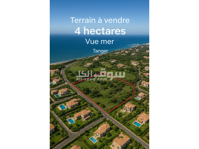 أرض محفظة للبيع بمساحة 4 هكتارات في منطقة أشقار بمدينة طنجة، تتميز بموقع استراتيجي وإطلالة مباشرة على البحر. الأرض مناسبة لمشاريع كبرى مثل الفلل الراقية، التجزئات، أو منتجع سياحي. الموقع قريب من البحر وكهوف هرقل والبنية التحتية الأساسية. للمزيد من التفاصيل يُرجى التواصل عبر الهاتف أو الواتساب.